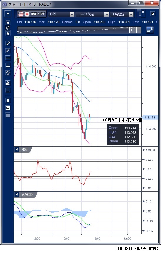 10月8日のドル/円相場は、東京が休日の中、朝方はドルが堅調な動きで114円回復を窺う動きとなりました。しかし、高値は113円94銭までで114円の壁に跳ね返され高値圏での小動きとなりました。 欧州時間に入ると、中国株安を受けた欧州株の下落やイタリアの予算計画をめぐる懸念などからリスクオフの流れが強まり、113円前半まで軟化する動きとなりました。 このドルの下落でMACDが売り転換しており、その後のドルは軟調な動きを示唆しています。 NY時間に入ってもドルの上値の重い動きは続き、113円を割り込むとストップロスの売りを巻き込み、一時112円82銭まで下落しました。 中国を訪問したポンペオ米国務長官は「中国と根本的な意見の相違がある」との見方を示したことから、米中貿易摩擦激化が懸念されたこともドル下落の背景にあったとの指摘もあります。 欧州時間のドル下落ではボリンジャーバンドを下抜けたもののバンドウォークは騙しで終わっていますが、NY時間のドル下落時には値幅は小さいながらもバンドウォークが形成されていたことがわかります。 NY終盤にかけては、短期ドル・ロングの投げが一巡すると、押し目買いの動きが強まり113円台を回復してNYを引けています。 ※チャートはドル円の1時間足ボリンジャーバンドRSIMACDを表示しています。