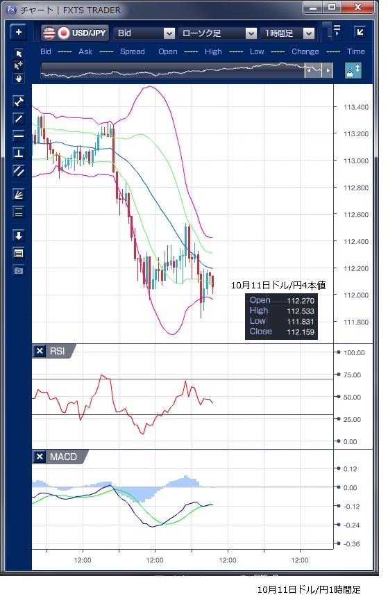 10月11日のドル/円相場は、東京時間では前日の海外市場でのドル安の流れを引き継ぎ軟調に推移しました。日経平均が一時1,000円を超える下げとなり、ドルも112円を割れました。しかし、午後に入り大幅安となったアジア株が下げ渋りはじめると、円高の動きは次第に弱まり112円台へ値を戻しました。 欧州時間に入ってもドルは底堅く推移、112円前半での動きが続きました。 この揉み合いの中MACDが買い転換しています。 NY時間に入ると、9月消費者物価指数が予想を下振れ、長期金利が低下したことで米国株が値を戻すと、ドルも買いが優勢となり、112円53銭の高値を付けました。しかし、その後米国株が大幅に下落、NYダウが一時700ドル以上の下げ幅となったことで、ドルも111円83銭まで下落しました。トランプ米大統領が「強いドルは必ずしも経済の助けにならない」との見方を示したと伝わったこともドル売りの要因になったとの指摘もあります。 ただし、NY時間のドル下落では安値を更新したものの、RSIの下げは限定的で111円台での下落圧力が強くないことが示唆されています。また、この下落でボリンジャーバンドを下抜けたものの一過性の動きに終わってバンドウォークにつながっていないこともドルの底堅さを示しているように見えます。 ※チャートはドル円の1時間足ボリンジャーバンドRSIMACDを表示しています。
