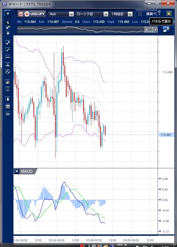 チャートは、ドル/円の1時間足ボリンジャーバンドMACDを表示しています。 昨日のドル/円相場は、113円台での保合いながら、徐々に値を下げていく展開となりました。 113円後半でスタートしたドル/円は、東京時間は113円60〜70銭を中心にもみあいが続きました。 市場では、中国の全国人民代表大会から新たな材料が出てこない限り、10日の欧州中央銀行(ECB)理事会待ちとのムードが強いようです。 先週末の米雇用統計で上下をやって、居心地のいい場所に戻ってきてしまったため、動くのは難しいとの指摘もありました。 海外時間に入ると、米連邦準備制度理事会(FRB)が発表した2月労働市場情勢指数(LMCI)が予想外のマイナスに落ち込んだことやブレイナード米FRB理事が「見通しが明らかになるまで、FRBは辛抱強さが必要」と強調したことなどから、早期の追加利上げの観測が後退しドルは軟化、113円23銭の安値をつけました。 テクニカルで見ると、MACDが先週末に売り転換しており、昨日のドル安を先取りして示唆する形となっています。 また、NYの引け間際に、ボリンジャーバンドの下抜けがありましたが、バンドの拡大はなく一過性のブレイクにとどまっており、明確な方向性は感じられないものとなっています。 本日は国内で10-12月期GDP改定値のほか、中国では貿易収支の発表が予定されていますが、経済指標が予想外のブレを見せない限り、113円半ばを中心とするもみあいが続く可能性が高いようです。