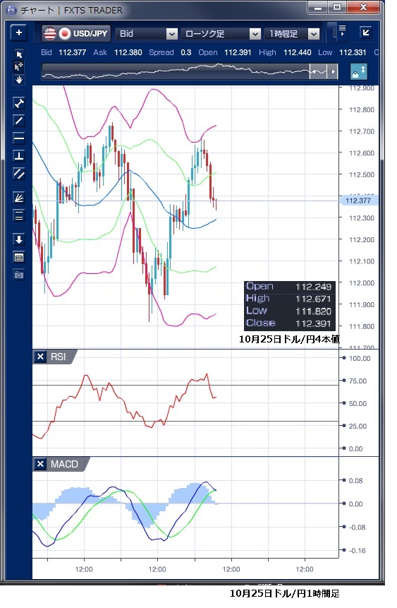 10月25日のドル/円相場は、東京午前、前日海外市場の流れを引き継ぎ軟調な動きとなりました。前日の米国株の大幅な下落を受け、日経平均が800円を超える下げになるなどアジア株は全面安で、リスク・オフの動きで円は幅広く買われ、ドル/円は一時111円82銭の安値を付けました。 しかし、111円台では押し目買い意欲も強く、ドルが下げ止まるとドルのショートカバーが優勢な動きとなり、112円台を回復、欧州勢が参入すると112円30銭水準まで値を戻しました。このドルの戻しのなか、MACDが買い転換し、その後のドル上昇を示唆していたことが確認できます。 NY時間に入ると、米国株が大幅に値を戻す動きとなり、ダウ工業株30種平均が一時上げ幅を500ドル強に広げたことなどを受け、ドルの買い戻しが強まり、112円62銭の高値を付けました。それに加え、予想を上回った米9月中古住宅販売成約指数もドルの下支え要因となったとの指摘もあります。 ただし、NYの引けにかけてドルは伸び悩み、112円40銭水準まで値を下げて引けています。また、この動きでMACDが売り転換していることから、本日の東京市場のドルは上値の重い動きから始まりそうです。 ※チャートはドル円の1時間足ボリンジャーバンドRSIMACDを表示しています。
