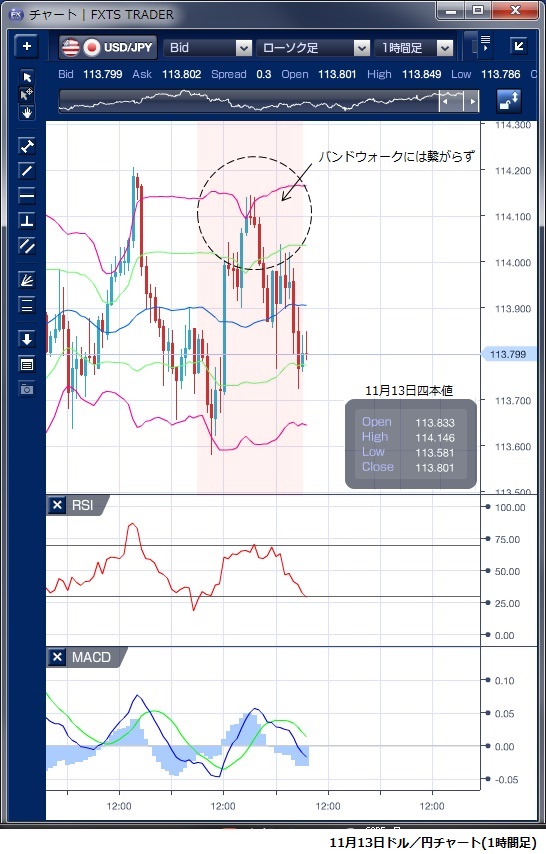 11月13日のドル/円相場は、東京時間午前では日経平均が一時700円を超える下げとなったことを受け、一時113円58銭まで軟化しました。 しかし、その後ムニューシン米財務長官と中国の劉鶴副首相が、電話で会談し協議を再開したとの報道や月末の米中首脳会談に先立ち、貿易問題の緊張を緩和するため劉副首相が近く米国を訪問するもようだの報道を受け、ドルは急速に値を戻し114円台を回復しました。 このアジア時間での上下動で、相場はボリンジャーバンドの上下のバンドにタッチしていますが、ともにバンドウォークにはつながらず、バンドが抵抗線となっていました。 海外時間に入ると、英国の欧州連合(EU)離脱を巡り、離脱協定に関する文書で英国とEUが事務レベルでの暫定合意に達したと伝わったことを受け、英ポンド/ドルが上昇し、それにつられてドル/円も上値を抑えられ、113円73銭まで下落しました。 原油先物の急落を受けて世界経済への成長鈍化が警戒されたことから、リスク回避の円買いとなったとの指摘もあります。 ドル/円は114円台に定着することができないものの、113円半ばを下抜けることなく方向感を失っています。 本日も、その傾向が続くことが予想されます。 ※チャートはドル円の1時間足ボリンジャーバンドRSIMACDを表示しています。