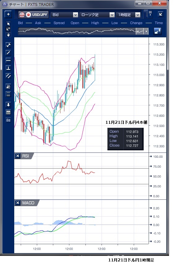 11月21日のドル/円相場は、東京時間からドルが底堅い動きとなりました。 前日の米国株下落を受け日経平均も下げて始まったものの、ドル/円への影響は限定的で112円半ばではドル買い圧力も強く、じりじりと反発する動きとなりました。 欧州時間に入ってもドルの底堅い動きが続き、オプションに絡むドル売りがうわさされていた113円を上抜けると、113円15銭まで上昇する動きとなりました。 ただし、この上昇で価格は東京時間の高値を更新したものの、RSIは切り下がっており、上値の詰まった印象があります。 NY時間に入ると、10月の米耐久財受注額は前月比で市場予想以上に減り、週間の米新規失業保険申請件数は市場予想以上に増えたことを受けドル売りが優勢となり、112円86銭まで押し戻される局面もありましたが、引けにかけては113円台を回復し113円10銭水準でNYを引けています。ただし、感謝祭の祝日前とあって積極的な動きとは言えず、ポジション調整の範囲内との指摘もあります。 ※チャートはドル円の1時間足ボリンジャーバンドRSIMACDを表示しています。