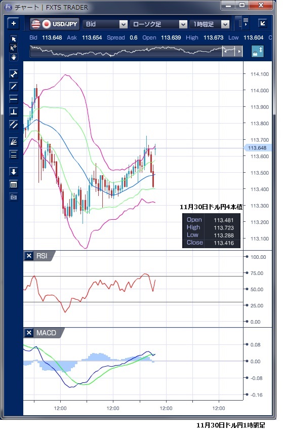 先週末、11月30日のドル/円相場は、米中首脳会談を控え、様子見ムードの強い動きとなりました。東京時間は113円前半で方向感なく、欧州時間以降はドルが底堅く推移したものの高値はNY時間の113円73銭まででした。またNY引けにかけてはポジション調整の動きで113円40銭水準まで押し戻されて週を越えています。 注目の米中首脳会談では、焦点の1月からの関税引き上げについて、知的財産権侵害についての交渉を直ちにスタートし90日を交渉期限とすることで合意し、その間発動を保留することとしました。米中貿易摩擦激化への懸念がやや後退したこと受けて、週明けのドルは若干高くスタートしましたが盛り上がりには欠ける動きとなっています。 ※チャートはドル円の1時間足ボリンジャーバンドRSIMACDを表示しています。