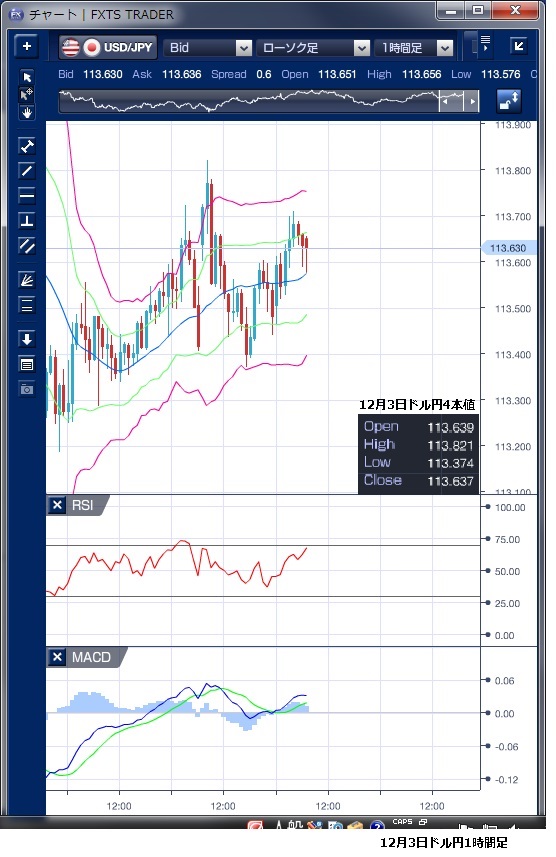 12月3日(月)のドル/円相場は、先週末の米中首脳会談で米国が年明けから予定していた中国製品への追加関税を90日間猶予することで合意したことを受け、貿易摩擦激化懸念の後退からドルが上昇する動きが先行しました。 週明け取引では、前週末終盤の水準から30銭程度気配値を切り上げた113円70銭水準で取引が始まり、一時11月28日以来の高値となる113円87銭をつけました。この上昇でボリンジャーバンド上抜けましたが、一過性の動きでバンド幅の拡大もなく、バンドウォークにはつながりませんでした。 その後、今回の合意は期限を先送りした猶予期間であり、米中両者の意見の隔たりが大きく、先行きは楽観できないとの見方が強く、一段の上値追いにはつながらず、欧州時間には113円37銭まで下押ししました。 NY時間に入ると、米サプライマネジメント協会(ISM)が発表した11月の製造業景況感指数が市場予想を上回ったことや米株式相場が大きく上昇したことなどを受けて113円71銭まで値を戻し、ほぼ高値圏でNYを引けています。 ※チャートはドル円の1時間足ボリンジャーバンドRSIMACDを表示しています。