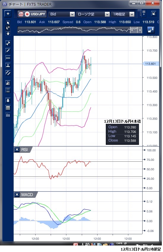 12月13日のドル/円相場は、英首相の信任、イタリアの赤字目標引き下げ、事実上米国への歩み寄りとみられる中国の産業政策変更方針など、リスクオンムードが広がりやすい状況を背景にドルが終始堅調な動きとなりました。東京朝方に113円21銭の安値を付けた後、東京午後から欧州序盤に足踏みする局面があったものの、ドルは底堅い動きを続けました。 NY時間では、中国が大量の米国産大豆購入したことが明らかになると米中貿易協議進展期待でドルは一時113円71銭の高値を付けました。ただし、テクニカルで見ると価格の上昇にもかかわらずRSIが頭打ちとなっており、ドルの上値が詰まってきている印象を受けます。また、NYの引けにかけてMACDが売り転換の可能性を示していることもあり、さらなる上値追いは慎重になるところでしょう。 ※チャートはドル円の1時間足ボリンジャーバンドRSIMACDを表示しています。