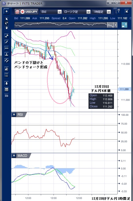 12月20日のドル/円相場は、東京朝方こそ実需のドル買いフローが優勢で112円60銭を付けたものの、その後日経平均が下げ幅を拡大し、米長期金利が前日つけた7カ月ぶりの低水準2.750%を割り込むとドルはじり安の展開となり112円水準まで値を下げました。 欧州勢が参入してくると112円を割り込み、損切りのドル売りを巻き込みながらドル下落が加速しました。NY時間に入っても米株式相場が前日に続き大幅に下げ、投資家のリスク回避姿勢が強まったことでドル売りが続き、一時110円82銭と9月11日以来ほぼ3カ月ぶりのドル安値を付けました。21日に期限を迎える米連邦政府の暫定予算の協議で米与野党が折り合えず、政府機関の一部が閉鎖されるとの懸念が強まったこともドル安要因と指摘されます。 このドル下落では、ボリンジャーバンドの下抜けとバンドウォークの形成が確認できます。ただし、NY序盤にはRSIが下げ止まっており、その後の111円割れでも安値を更新できていないことから、110円台の下攻めはやり過ぎだったことが窺えます。 NY引けにかけてはドルの買い戻しが入り、111円30銭水準でNYを引けています。米国株が下げ止まらず、昨日も大幅な下落となったことから、本日の日本株も軟調な動きが予想され、ドルの上値の重い動きが続きそうです。 ※チャートはドル円の1時間足ボリンジャーバンドRSIMACDを表示しています。