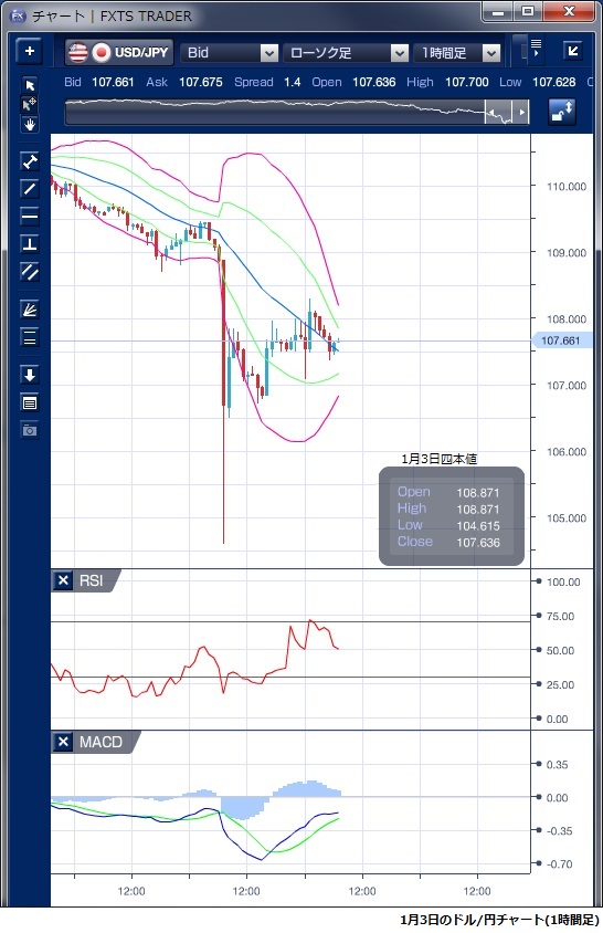 1月3日のドル/円相場は、東京時間朝方にドルが急落する動きとなりました。 前日にアップルの売上見通し下方修正によりNYダウが急落したことを受けてリスク・オフムードが高まり、ドル売りが先行し、108円を割り込むとストップロスのドル売りを巻き込みながら一気に104円62銭まで下落しました。 東京が正月休みであり、時間帯的にもNY引け後の薄いマーケットであったことで相場の動きが加速したといえます。 ただし、ストップロスが一巡するとドルの買い戻しが優勢となり107円台を回復、その後は107円台を中心とした方向感を決めにくい相場が続きました。 NY時間に入ると米国の12月ISM製造業景況指数が予想以上に悪化し、2016年11月以降ほぼ2年ぶり低水準となったことやNYダウが一時600ドル以上下落したことからドル売りが強まる局面もありましたが、本日に米雇用統計の発表を控えていることなどからポジション調整のドル・ショートカバーが入り108円台を回復し107円70銭水準でNYを引きえています。 東京勢が休んでいるうちに、相場は昨年の安値水準まで下落し、その後は108円台を回復するというボラタイルな動きとなりました。 本日は、昨日のNYダウが大幅安となっていることで大発会の日経平均株価の軟調スタートが予想されることから、ドルも上値の重い動きで始まりそうです。 ただし、米雇用統計を見極めたいという思惑も強く、東京時間は動きにくい展開となる可能性も高いでしょう。 ※チャートはドル円の1時間足ボリンジャーバンドRSIMACDを表示しています。