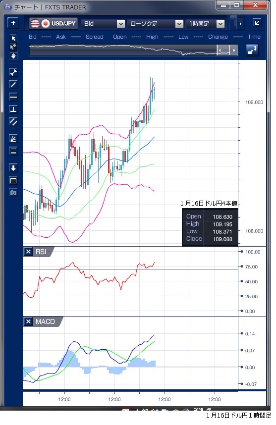 1月16日のドル/円相場は、108円後半で東京がスタートした後、日経平均の下げ幅拡大や本邦実需筋のドル売りを受けて、一時108円37銭まで下落し、上値の重さが意識される動きとなりました。しかし、108円前半ではドル押し目買いの意欲も強く下げ渋り、欧州勢の参入とともに買い戻しが優勢となりました。 欧州時間にMACDが買い転換しており、海外時間でのドル上昇を示唆する形となっています。 NY時間に入ると、米国の住宅関連指標が予想を上回ったことや米大手金融の好決算を受けて投資家心理が改善したことでリスクオフのムードが後退しドルが買われる動きとなりました。ドルは一時109円20銭まで上昇し109円台を維持して引けています。 ただ、価格の大幅上昇にもかかわらず、RSIが頭打ちとなっており、上値の詰まった印象を受けます。また、上昇しているボリンジャーバンドの上方バンドに絡みながら相場も上昇しているものの、下方バンドの動きが不安定でバンドウォークにはつながっておらず、これも上昇力に限りがあることを示唆しているように見えます。 ※チャートは、ドル/円の1時間足ボリンジャーバンドRSIMACDを表示しています。
