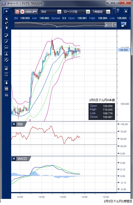 2月5日のドル/円相場は、109円後半で方向感なく小動きが続きました。東京時間と欧州時間にともに110円台を付ける局面があったものの、滞空時間は短く、上値の限られた動きでした。ただし、下値も東京時間では109円77銭まで、海外時間でも109円80銭までと底堅く、動きにくい相場が続いていたことがわかります。 テクニカルで見ても、ボリンジャーバンドのバンド幅は縮小してきており相場に方向性と勢いが感じられません。MACDを見ると、昨日は終始ドル売りの流れとなっているものの、海外市場を通してゼロ水準に近づきながら交錯しつつあり、これも方向性を見出しにくいものとなっています。 本日は、日本時間11時からトランプ大統領の一般教書演説が行われるため市場はその内容に注目しており、朝方は模様眺めのムードが強くなりそうです。 ※チャートは、ドル/円の1時間足ボリンジャーバンドRSIMACDを表示しています。
