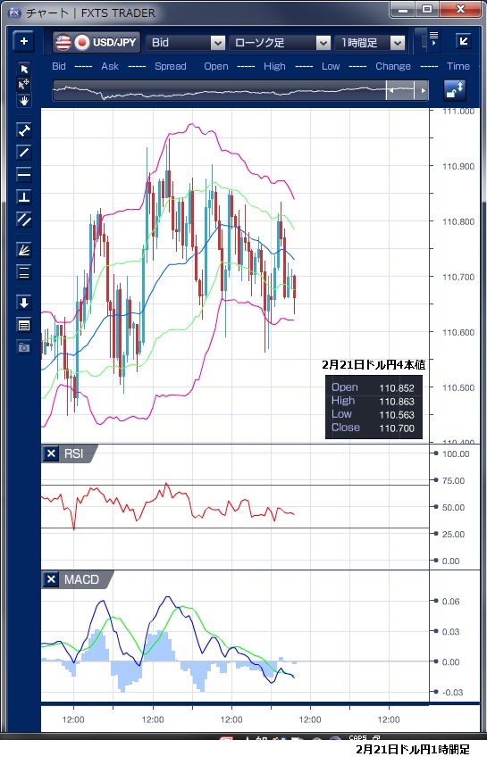 2月21日のドル/円相場は、前日同様に110円後半での取引が続きました。東京朝方の取引で実需の売りなどに押され一時110円59銭まで押したものの、その後、米中貿易交渉で、技術移転、知的財産権、サービス、為替、農業、非関税障壁と主要な構造問題で覚書が準備されているとの報道を受け、値を戻す動きとなりました。 その後も110円後半で小動きが続きましたが、ドルの上値はやや重く、NY序盤には110円56銭の安値を付けました。米経済指標が軒並み市場予想を下回ったことがドル売り要因となったと指摘されます。米経済指標では、12月の米耐久財受注額が前月比1.2%増と市場予想を下回り、2月のフィラデルフィア連銀製造業景況指数はマイナス4.1と2016年5月以来のマイナス圏に落ち込みました。さらに、1月の米中古住宅販売件数も前月比マイナス1.2%と市場予想に反して減少しました。 ただし、110円ミドルは底堅く、110円70銭水準に値を戻してNYを引けています。テクニカルで見ると、MACDが昨日は一貫して売りシグナルとなっており、ややドルの上値の重さを感じさせますが、RSIは中立水準での推移となっており、明確な方向性は見出せません。 ※チャートは、ドル/円の1時間足ボリンジャーバンドRSIMACDを表示しています。