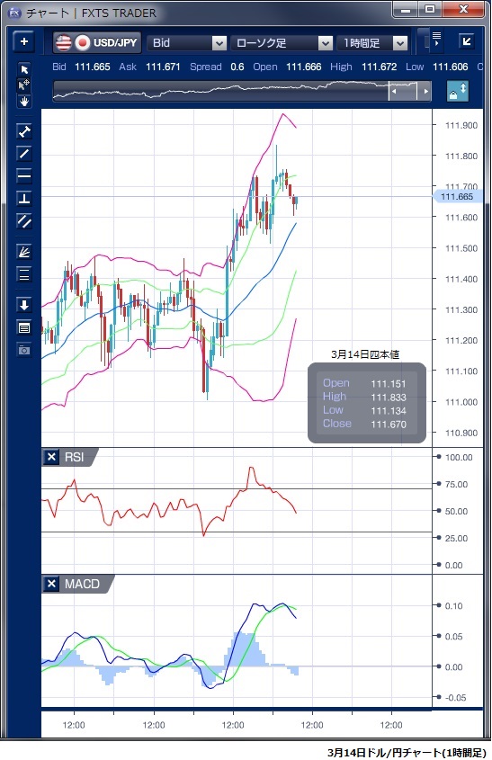 3月14日のドル/円相場は、ドルが底堅い動きとなりました。 前日のNY時間に、トランプ大統領が中国との通商合意は急いでいないと語ったことをうけて111円01銭まで下落した流れで、東京朝方は111円前半での動きで始まりましたが、その後は実需の買いや日銀が15日の金融政策決定会合で金融緩和の強化を検討するとの思惑が広がったことでドル買いが優勢となり111円半ば越えの動きとなりました。 その後、欧州時間までドルは堅調に推移し、軽いバンドウォークの動きを見せました。 MACDを見ると、東京朝方にはすでに買い転換しており、その後のドル上昇を示唆していたことがわかります。 NY時間に入ると、予想を上回った米輸入物価指数で米債利回りが上昇や日銀金融政策決定会合への思惑が続き、ドルは一時111円83銭まで上昇しました。 ただし、111円後半は上値を抑えられ、またMACDも売り転換していることから、徐々にドルが売り戻され111円70銭水準でNYを引けています。 波乱要因の英議会下院の採決では、離脱期限を延長する動議は予想通り可決されたものの、不透明感がくすぶっており、今後も注視する必要があるでしょう。 ※チャートは、ドル/円の1時間足ボリンジャーバンドRSIMACDを表示しています。