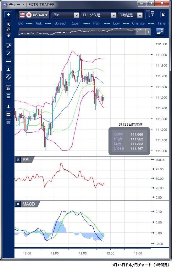 先週末(3月15日)のドル/円相場は、東京朝方から仲値公示にかけてじりじりと上昇し、111円90銭の高値を付けました。 年度末を控えた実需に加え、国内投資家がドル買いの水準を切り上げてきたとの指摘もあります。 しかし、正午過ぎにロシアのタス通信が、北朝鮮の崔外務次官が、北朝鮮は米国との核協議を停止することを検討していると述べたと伝えたことからドル売りが優勢となり、111円49銭まで反落しました。 この上下動で、ボリンジャーバンドに上下ともにタッチしに行ったものの、バンドの拡大は起きず、方向感のない動きとなっています。 ただし、MACDを見るとこの反落で買い転換の騙しが出ており、その後のドル下落を示唆する形となっていました。 東京午後から欧州時間にかけては、111円70銭水準を中心とした小動きが続きました。 NY時間に入ると、3月のニューヨーク連銀製造業景況指数は市場予想に反して前月から急低下し、2月の米鉱工業生産指数も予想を下回ったことからドル売りが強まり、一時111円38銭の安値を付けました。 しかし、米国株が堅調な動きを続けたことで、ドルの下目も堅く、NY引けにかけては111円50銭前後での保ち合いが続きました。 ※チャートは、ドル/円の1時間足ボリンジャーバンドRSIMACDを表示しています。