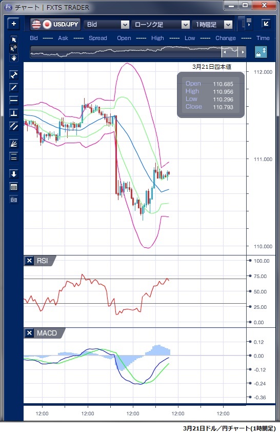 3月21日のドル/円相場は、米連邦準備理事会(FRB)が年内の利上げ見送り方針を示したのを受けて円買い・ドル売りとなった前日からの流れを引き継ぎドル安となりました。 休日の東京時間からドルは軟化し、欧州時間には一時110円30銭と2月中旬以来の安値を付けました。 ただし、テクニカルで見ると、欧州時間の安値では価格が安値を更新したもののRSIは横ばいで、MACDも買い転換の兆しを見せており、その後の反発を示唆する形となっていました。 NY時間に入ると、3月のフィラデルフィア連銀製造業景況指数が前月から大きく上昇し、市場予想も上回ったことや米新規失業保険申請件数も前週比で市場予想以上に減ったことなどから、ドルの買い戻しが優勢となり、110円95銭まで値を戻しまし、その後110円80銭水準で揉み合いを続けNYを引けています。 ※チャートは、ドル/円の1時間足ボリンジャーバンドRSIMACDを表示しています。