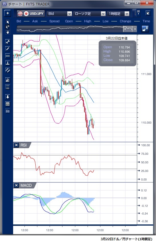 先週末(3月22日)のドル/円相場は、東京朝方こそ本邦実需のドル買いで上値を伸ばしたものの111円台は回復できず、その後は日本や中国の株価が前日比でマイナス圏に沈むのを眺めつつ、伸び悩む動きとなりました。 欧州時間に入ると、ユーロ圏やドイツ、フランスの3月の製造業購買担当者景気指数(PMI)が軒並み市場予想を下回ったことで世界的な景気減速に対する警戒感が高まり、円買いが優勢となりました。 さらにNY時間に入ると、3月の米購買担当者景気指数(PMI)速報値で製造業指数が1年9カ月ぶりの水準に低下したことや3カ月物と10年物の米国債券利回りが逆転したことを材料にドル売りが加速、一時109円74銭と2月11日以来、およそ1カ月ぶりの安値を付けました。 長短金利の逆転(逆イールド)は景気後退の前触れとして警戒されます。 その後も米国株が大幅に下落したことで、ドルは大きな回復はできず109円90銭水準で週を越えています。 欧州時間からのドル下落局面では、ボリンジャーバンドの下抜けと強いバンドウォークの動きが確認できます。 ※チャートは、ドル/円の1時間足ボリンジャーバンドRSIMACDを表示しています。