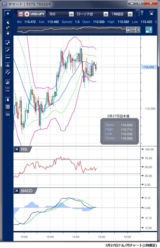 3月27日のドル/円相場は、110円半ばを中心に方向感のない動きが続きました。 東京時間では、実質的な年度内最終売買日にあたり実需などの売買が交錯し、値幅は上下30銭弱にとどまりました。 欧州時間では、米長期金利の低下に一服感が出て円売りにつながり一時110円71銭の高値を付けたものの、その後に欧州中央銀行(ECB)のドラギ総裁が「新たな物価見通しに応じて政策金利の先行き指針を調整していく」と述べたことで、欧州景気の減速を受け利上げ時期がさらに遅れる可能性を示唆したと受けとめられ、リスクオフの流れとなり110円23銭まで値を下げました。 NY時間では、再び110円30銭から50銭の間で方向感のない小動きが続きました。 テクニカルで見てもボリンジャーバンドは横ばいで、バンドにタッチしてもバンドウォークにはつながらず、相場に方向性と勢いがないことが示されています。 ※チャートは、ドル/円の1時間足ボリンジャーバンドRSIMACDを表示しています。