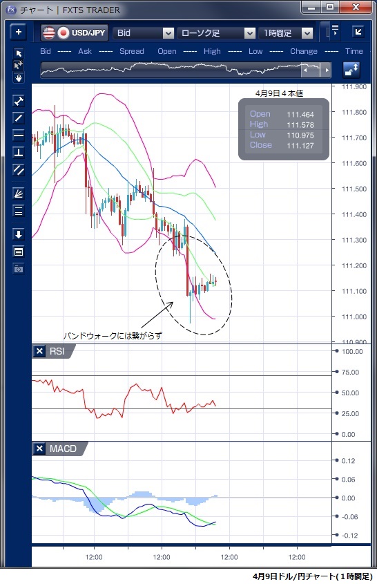 4月9日のドル/円相場は、東京午前では仲値公示と前後して111円55銭まで上昇したものの、その後はアジア株の伸び悩みを背景に、111円27銭まで下押しました。 新規材料がなく見送りムード が強かったため、取引も盛り上がりませんでした。 その後欧州時間では111円30銭水準で小動きが続きましたが、NY序盤に入ると国際通貨基金(IMF)が2019年の世界経済の成長率見通しを金融危機以降の低水準に引き下げたことや米国政府が対欧州連合(EU)輸入品に報復関税措置を警告したことなどを材料にリスクオフの流れとなり円買いが強まり、一時110円98銭まで下押しました。 この下落でボリンジャーバンドを下抜けたものの、バンド幅拡大傾向のなかでのブレイクであり、きれいなバンドウォークにはつながりませんでした。 その後は、2月の米消費者物価指数(CPI)や3月開催分の米連邦公開市場委員会(FOMC)議事要旨の発表を本日に控えていることもあり、模様眺めの動きが強まり111円前半での小動きに終始しました。 本日は、ドルの上値が重く見えるものの、110円台を積極的に売り込んでいく材料もなく、アジア株の動向をにらみながらの小動きが続きそうです。 ※チャートは、ドル/円の1時間足ボリンジャーバンドRSIMACDを表示しています。