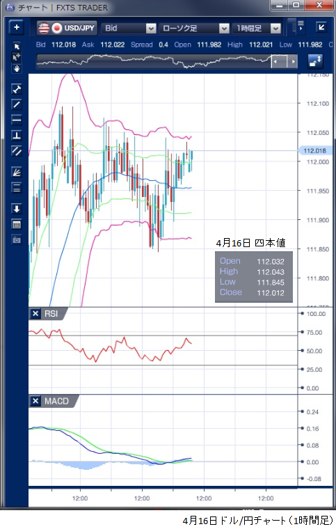 4月16日のドル/円相場は、前日同様112円を挟んで小動きが続きました。 東京朝方から売買が交錯し、上値では久々の高値圏とあって本邦実需が売り注文を出した ほか、短期筋も利食いのドル売りをだし上値が抑えられました。 また、ワシントンで行われている日米通商交渉がドルの重しになったとの指摘もあります。 海外時間に入っても動意に乏しく揉み合いが続きました。 米国の3月設備稼働率が予想を下回ったことがドル売り要因であったものの、4月NAHB住宅市場指数が予想通り半年ぶりの高水準になったことがドル買い要因となり、結果としてどちらにも動けない状況でした。 NY時間での値幅は14銭にとどまり、一日を通しても20銭に満たない小動きとなっています。 テクニカルを見ても、ボリンジャーバンドはバンド幅に変化なく横ばいを続けており、相場にエネルギーがないことが示唆されています。 ※チャートは、ドル/円の1時間足ボリンジャーバンドRSIMACDを表示しています。