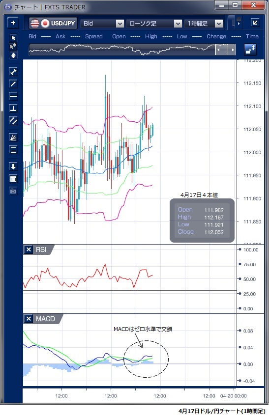 4月17日のドル/円相場は、東京時間では日経平均が連日の年初来高値更新となる中、日米通商交渉で、懸案だった為替条項に関する議論が目立って協議されなかったことで、市場では警戒感がやや後退し、ドル買いが優勢となり、一時112円17銭と昨年12月20日以来4カ月ぶりに高値を更新しました 。 この上昇で、ボリンジャーバンドを大きく上抜けたものの、ドルの上昇は続かず、すぐに反落しバンドウォークにはつながりませんでした。 その後は再び112円を挟んだ方向感のない小動きがNY序盤まで続きましたが、NY中盤に入ると米国の2月貿易赤字が縮小したこと、1-3月期国内総生産(GDP)の成長見通しが引き上げられたこと、さらに米中貿易協議は早ければ5月末にも合意成立の見通しとなったことなどを受け、ドル買いが優勢となりました。 ただし、NY時間の高値は112円12銭までで、東京時間の高値を更新できず、上昇力にも限界があることが示唆されています。 ボリンジャーバンドの明確な拡大が見られず、MACDもゼロ水準に近いところでシグナルと交錯しており、依然方向感のない相場が続いていることが示されています。 ※チャートは、ドル/円の1時間足ボリンジャーバンドRSIMACDを表示しています。