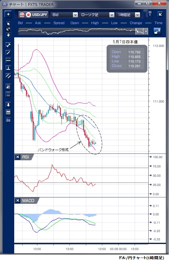 5月7日のドル/円相場は、110円70銭水準でスタートした後、ドルの上値が重い動きが続きました。 日経平均株価が300円を超える下落となったこともドルを圧迫する要因となりました。 海外時間に入ると、ライトハイザーUSTR代表やムニューシン米財務長官が2000億ドル規模の中国製品輸入に対する関税を従来の10%から25%に引き上げる方針を確認したため、米中貿易摩擦の深刻化懸念が増大し、ドルは一段と下落、一時110円17銭の安値を付けました。 また、NYダウが500ドル近く下落したこともリスク・オフのドル安につながったと指摘されます。 テクニカルで見ると、NY時間に小さなバンドウォークが確認できます。 また、MACDもマイナス圏で売りサインを続けており、ドルの上値の重さを感じさせる形となっています。 また、日足ベースで見ると、一目均衡表で遅行スパンが売り転換しており、相場が先行スパンの雲を下抜けドル下落リスクが高まっていることが示唆されています。 ※チャートは、ドル/円の1時間足ボリンジャーバンドRSIMACDを表示しています。