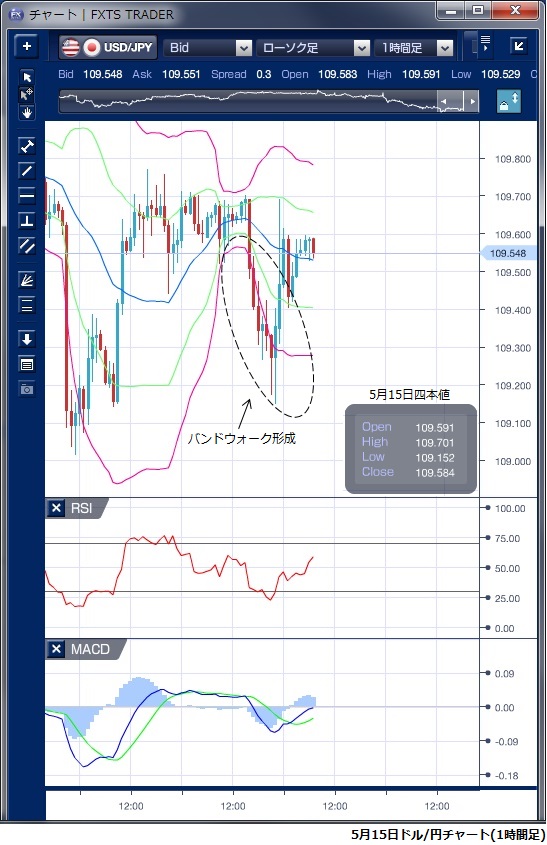 5月15日のドル/円相場は、東京時間は109円半ばで方向感のない動きが続きました。 米中貿易摩擦が懸念される中、109円前半では本邦投資家からの買い意欲が強いことも確認され動きにくい状況が続きました。 欧州時間に入ると中国の4月の主要経済指標が市場予想を下回ったことを受けてドル売りが優勢となり、さらにNY序盤に発表された4月の米小売売上高が前月比0.2%減と市場予想の0.2%増に反して減ったうえ、4月の米鉱工業生産も低下し市場予想に届かなかったことから、ドルは一時109円15銭まで下落しました。 この下落では、ボリンジャーバンドを下抜けはっきりしたバンドウォークが形成されていることがわかります。 その後、「トランプ米大統領は欧州製自動車への追加関税導入の判断を最大で半年先送りする」と米主要メディアが報じたことから貿易摩擦への警戒感が和らぎ、ドルは買い戻しが優勢となり109円69銭まで値を戻しました。 昨日は、再び109円前半を試したものの、下値が堅いことが確認されたことで、本日も109円台半ばを中心として動きにくい相場が続きそうです。 ※チャートは、ドル/円の1時間足ボリンジャーバンドRSIMACDを表示しています。