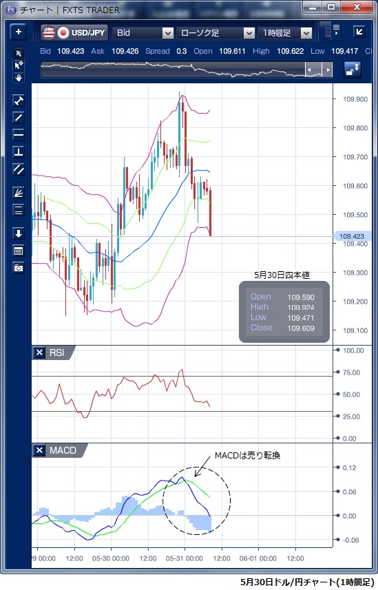 5月30日のドル/円相場は、東京から欧州時間にかけてはドルが底堅く推移しました。 東京朝方の取引では、本邦輸入企業のドル買いが見られたほか、前日に1年8カ月ぶりの水準まで低下した米長期金利が2.26% 台まで持ち直したことでドルは下支えされました。 ただし、米長期金利の反発が頭打ちとなると、ドルの上昇は一服する動きとなりました。 欧州時間には前日の高値を上回ってきたものの、RSIは横ばいでやや上値の詰まった形となっていました。 NY時間に入ると、NYダウが3営業日ぶりに反発したことを好感してドル買いが優勢となり一時109円92銭まで上昇しました。 しかし、米1-3月期コアPCE改定値が予想外に下方修正され3年ぶりの低水準になったことや、4月中古住宅販売が減少したことから、景気後退懸念が強まり、ドルは急速に値を下げ109円47銭まで反落し、109円60銭水準でNYを引けています。 NY時間の上昇で上方ボリンジャーバンドにタッチしたものの上値抵抗として機能しており、またその後のドル下落でMACDが売り転換していることから、本日はややドルの上値の重い動きが予想されます。 ※チャートは、ドル/円の1時間足ボリンジャーバンドRSIMACDを表示しています。