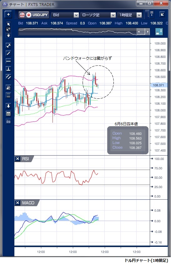 6月6日のドル/円相場は、東京時間から欧州時間にかけては108円前半でドルの上値の重い動きが続きました。 早朝の取引で米国のメキシコの移民をめぐる会合が決裂したと伝わり、リスク回避の円買いが優勢になったと指摘されます。 ただし、108円割れは回避され、小動きが続きました。 NY時間に入ると、米新規失業保険申請件数が予想より弱い内容だったことを受け一時108円03銭の安値を付けましたが、5月米雇用統計の結果を見極めたいとして、さらなるドル売りにはつながりませんでした。 その後、ブルームバーグ通信が「米政府はメキシコへの追加関税の発動を先送りすることも検討している」と報じたことでドル買戻しが優勢となり、108円56銭まで値を戻しました。 もっとも、米政府が「米国は依然としてメキシコからの輸入品に対する追加関税の発動を進めている」との見解を示すとやや上値が重くなり108円40銭水準でNYを引けています。 NY時間のドル買戻しでボリンジャーバンドを上抜けたものの、一過性の動きで終わっており、相場に明確な方向性がないことが示唆されています。 本日の米雇用統計を見極めたいとの思惑も強く、本日も動きにくい相場が続きそうです。 ※チャートは、ドル/円の1時間足ボリンジャーバンドRSIMACDを表示しています。