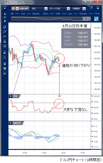 6月12日のドル/円相場は、108円台前半での小動きが続きました。 東京時間では、108円50銭を挟んだ極めて狭い動きとなった後、欧州参入後に日経平均株価や上海などアジア株式相場の下落を嫌気したドル売りに108円22銭の安値を付けました。 もっとも、この下落では価格が切り下がったものの、RSIは大きくは下落せず、下値も詰まった印象を与えるものとなっています。 NY時間に入ると、5月の米消費者物価指数(CPI)でエネルギー・食品を除くコア指数が前月比0.1%上昇と市場予想を下回ったことでドル売りの反応となりましたが、下値は108円26銭までで、その後は英国の欧州連合(EU)離脱を巡る不透明感からドルが対ポンドなど欧州通貨に対して上昇すると、対円でもドル買いが勢いを増し108円55銭まで値を戻してNYを引けています。 市場では、米連邦公開市場委員会(FOMC)や20カ国・地域首脳会議(G20サミット)など重要日程を月内に控え、様子見姿勢が強まっているとの指摘もあり、当面108円台での方向感のない相場が続きそうです。 ※チャートは、ドル/円の1時間足ボリンジャーバンドRSIMACDを表示しています。