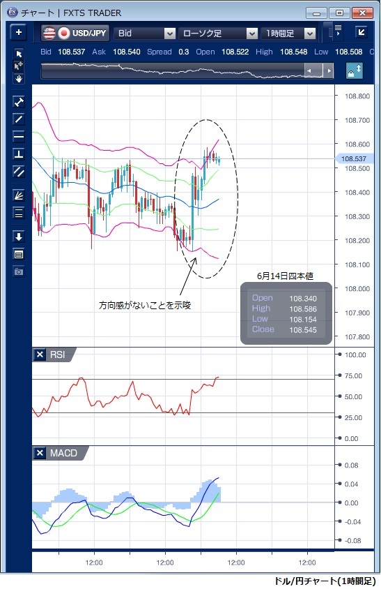 先週末(6月14日)のドル/円相場は、東京から欧州時間にかけては108円前半で上値の重い動きとなりました。 中国の5月の工業生産高や1〜5月の固定資産投資額が市場予想を下回ったことで、中国経済の減速への警戒感が強まったことがドルを圧迫する要因となったとの指摘もあります。 また、市場の関心は今週の米連邦公開市場委員会(FOMC)に向けられており、今週のFOMCでは利下げは見込まれていないものの、多くの市場参加者は7月に利下げが行われる可能性が高いとみていることもドルの上値を抑えることとなっています。 NY時間では、序盤に発表された5月の米小売売上高が前月比0.5%増と市場予想をわずかに下回ったものの、4月分が0.2%減から0.3%増に上方修正されたことから米個人消費の勢いが想定していたより力強いことを示したとの見方からドルの買い戻しが優勢となり108円59銭まで値を戻しました。 テクニカルで見ると、108円台にあるボリンジャーバンドの上下のバンドを行ったり来たりしており、相場に方向性がないことが示されています。 ただし、下値が切り上げってきていることから、目先は上値試しが先行する可能性がありそうです。 ※チャートは、ドル/円の1時間足ボリンジャーバンドRSIMACDを表示しています。