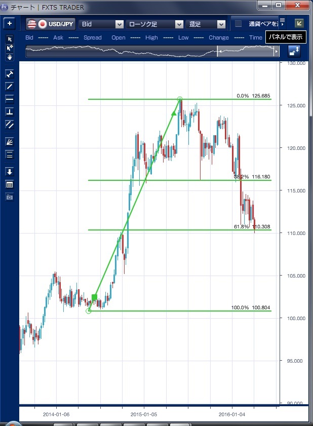 チャートは、ドル/円の週足フィボナッチリトレイスメントを表示しています。 昨日のドル/円相場は、日経平均株価の下落とともに終始軟調な展開が続きました。 東京朝方からドル売り圧力が強く、前日の安値を割り込むと111円を突破し、欧州参入時には3月17日の安値110円67銭も下抜ける動きとなりました。 その後110円後半へ値を戻す局面があったものの、NY時間に入ると米国2月貿易赤字の予想以上の拡大で1-3月期の国内総生産(GDP)見通し引き下げに伴うドル売りが強まったことや、国際通貨基金(IMF)のラガルド専務理事が世界リスクの高まりを警告したことなどがリスク回避の円買いに繋がりました。 さらに、安倍首相が米ウォール・ストリート・ジャーナルのインタビューで「競争的な通貨安政策は避けなければならない」と語ったと伝わり円高が加速し、一時1年5ヶ月ぶりの安値となる109円95銭をつけました。 ただし、110円割れの滞空時間は短く、すぐに110円を回復し110円32銭でNYを引けています。 テクニカルで見ると、2014年5月の安値から昨年の高値までの上昇幅の61.8%戻しが110円30銭レベルにあり、実体としてはこの水準がかろうじて維持されました。 節目の110円を割り込んだことで相場が加速することを期待していた海外ファンド筋には意外感があるようで、ここからさらに売り込んでいけるかどうかが注目されます。 実体として110円30銭レベルを割り込むと、次のめどは2011年10月の安値から昨年の高値までの上昇幅の38.2%戻しにあたる106円50銭レベルが視野に入ってくることとなりそうです。
