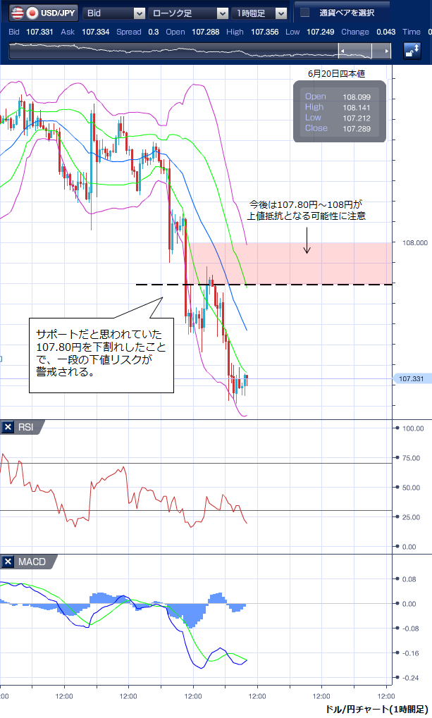 6月20日のドル/円相場は、東京朝方に海外投機筋を中心に米国債が買い戻され、米10年国債利回りが1.9740%と2016年11月の米大統領選前の水準まで低下したことを受けドル売りが強まり108円を下抜き、さらにサポートとみられていた107円80銭を割り込むとストップを巻き込んで下落に弾みがつき、一時107円55銭と1月4日以来の安値をつけました。 その後欧州勢が参入すると、ドルの買い戻しも見られましたが、高値も107円87銭までで、108円を回復することはできませんでした。 NY時間に入ると、フィラデルフィア連銀製造業景況指数や景気先行指数が市場予想を下回ったことから再びドル売り圧力が強まり、さらにイラン革命防衛隊が米国の無人偵察機を撃墜したと伝わったことから米国の軍事行動への警戒感が強まり、ドルは107円21銭まで下落しました。 NY終盤にトランプ大統領がイランの米無人偵察機撃墜について「意図的な撃墜とは信じがたい」と述べるとドルの買い戻しが入り107円30銭水準でNYを引けています。 テクニカルで見るとサポートであった107円80銭を下抜けてしまったことで、一段の下値リスクが警戒されます。 また、当面は107円80銭〜108円水準が強い上値抵抗となる可能性が高く、ドルの戻りは限られたものとなりそうです。 ※チャートは、ドル/円の1時間足ボリンジャーバンドRSIMACDを表示しています。