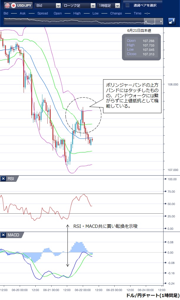 ドル円の前日の為替相場の動きを、各テクニカルで検証します。