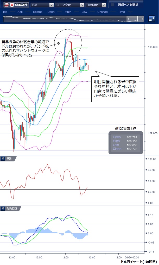 6月27日のドル/円相場は、アジアから欧州時間ではドルが底堅い動きとなりました。 一部香港紙が、米国と中国が、両国の首脳会談を前に、貿易戦争の一時休戦で合意したと伝えたことが手掛かりとなり、108円を上抜け、一時108円15銭の高値を付けました。 この動きでボリンジャーバンドを上抜けたものの、バンドの拡大は伴わずバンドウォークにはつながらず、その後反落しています。 NY時間に入ると、序盤に発表された週間の新規失業保険申請件数が前週比1万人増の22万7000人と市場予想以上に増えたことや、米ウォール・ストリート・ジャーナルが、「中国が停戦の条件として米国に対してファーウェイへの禁輸措置やすべての制裁関税の解除を求めている」と報じ米中首脳会談の不透明感が意識されたことなどからドルは軟調な動きとなり、107円67銭まで下落し、107円80銭水準でNYを引けています。 いよいよ明日に行われる米中首脳会談を前に、本日は107円台で動意に乏しい動きとなることが予想されます。 ※チャートは、ドル/円の1時間足ボリンジャーバンドRSIMACDを表示しています。