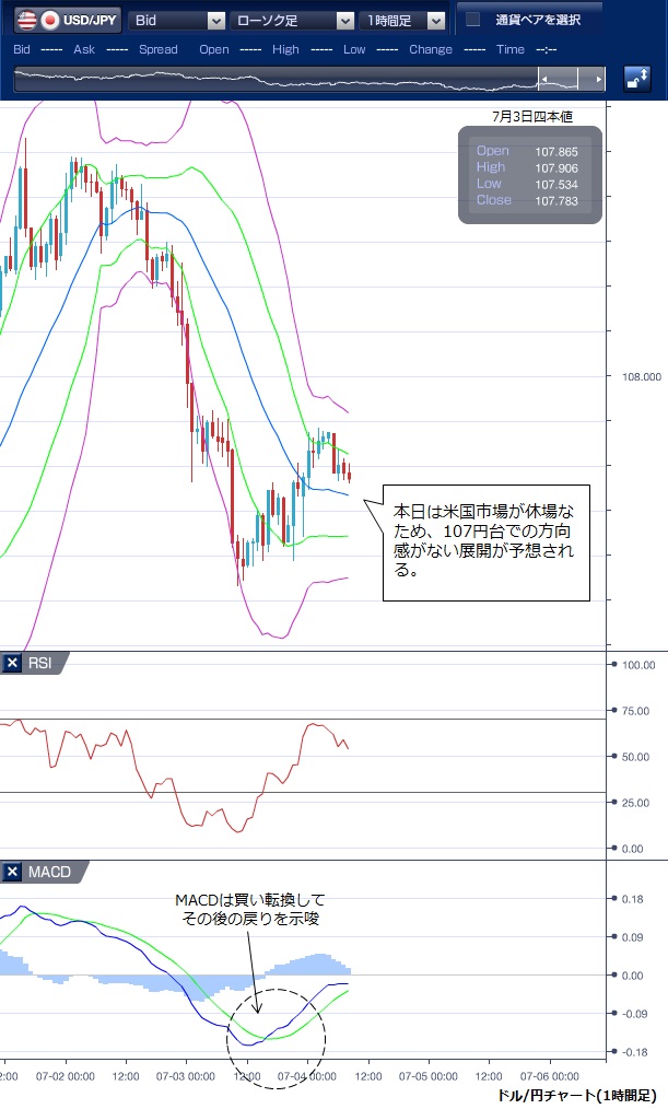 7月3日のドル/円相場は、東京時間朝方から軟調な動きとなり、米長期金利の低下や中国と日本の株価下落に反応し一時107円54銭まで下落しました。 米10年国債利回りは1.9481%付近と2016年11月9日以来、2年8カ月ぶりの低水準まで落ちています。 トランプ米大統領が、セントルイス地区連銀のクリストファー・ウォラー執行副総裁と欧州復興開発銀行(EBRD)米国理事のジュディ・シェルトン氏をFRB理事に指名する意向を示したことで、米金融緩和の長期化が想起されたことが原因と指摘されます。 ただし、107円半ばからは下値も堅く、しばらく揉み合った後、ドルは反発に転じました。 欧州参入時には、MACDが買い転換しており、海外時間でのドルの戻りを先取りする形となっていました。 NY時間に入ると、序盤に発表されたADP雇用リポートで、非農業部門の雇用者数が前月から10万2000人増と市場予想ほど増えなかったことで、ドルが下押す局面もあったものの、その後はNYダウが4日続伸し、過去最高値を9カ月ぶりに更新したことをうけてドルは底堅く推移し、107円85銭水準でNYを引けています。 本日は、米国が独立記念日で休日ということもあり、107円台で方向感のない動きが続きそうです。 ※チャートは、ドル/円の1時間足ボリンジャーバンドRSIMACDを表示しています。