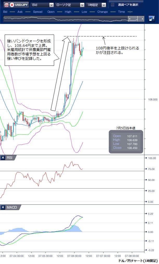 先週末(7月5日)のドル/円相場は、東京時間では米国の休日明けで6月の雇用統計を控えた週末とあって、取引は低迷し107円後半での小動きが続きました。 欧州勢が参入してくると、ドルはじりじりと値を上げ108円を回復しましたが、米雇用統計の発表までは上値も限られたものでした。 ただし、ボリンジャーバンドを見るとすでにバンドの拡大を伴いながら上方バンドを上抜けてバンドウォークが形成され始めており、その後のドル上昇を示唆していました。 注目の米雇用統計では、非農業部門の雇用者数が前月比22万4000人増と、前月の7万2000人から大きく拡大し、市場予想の16万人増も上回りました。 これを受けてドルは一段の上昇となり、強いバンドウォークを形成しながら108円64銭と6月中旬以来ほぼ2週間半ぶりの高値を付けました。 ただ、米雇用の増加ペースは減速基調にあり、平均時給の伸びは市場予想よりやや鈍かったことから、ドル買いが一巡するとドルは高値圏での揉み合いとなってNYを引けています。 6月以降、ドルの上値は108円半ばで抑えられており、この水準が強い抵抗に見えます。 この水準を上抜けると、ドルの戻り基調が確認されるため、週前半では、この上値の攻防が注目されます。 ※チャートは、ドル/円の1時間足ボリンジャーバンドRSIMACDを表示しています。