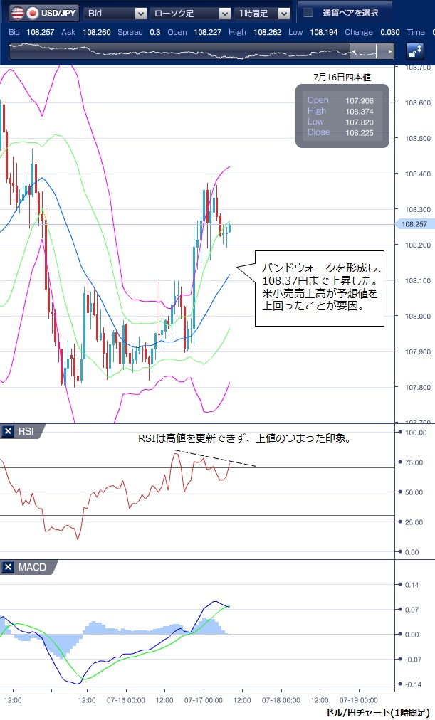 7月16日のドル/円相場は、東京時間では108円を挟んで方向感のない動きが続きました。 欧州時間序盤にドルが買われたものの、すぐに反落、東京時間と同様に108円を挟んで小動きとなりました。 NY時間に入ると、6月の小売売上高が前月比0.4%増加と、4カ月連続で増え、伸び率は市場予想の0.1%程度を上回ったことからドル買いが優勢となり、一時108円37銭の高値を付けました。 良好な米経済指標を受けて景気減速への警戒感が後退し、米長期金利が一時2.14%と前日比で0.05%上昇したこともドルの支援材料となったと指摘されます。 この上昇で、ボリンジャーバンドの上抜けとバンドウォークが形成されたことが確認できます。 ただし、欧州高値を上回ったものの、RSIは高値を更新できておらず、ドルの上値の詰まった印象となっています。 ※チャートは、ドル/円の1時間足ボリンジャーバンドRSIMACDを表示しています。