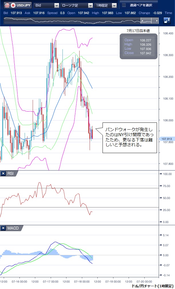 7月17日のドル/円相場は、東京時間からNY序盤までは108円前半での方向感のない動きが続きました。 108円ちょうど近辺は底堅い半面、108円30銭水準では頭を押さえられている動きでした。 その後発表された6月の米住宅着工件数が前月比0.9%減の125万3000戸と市場予想を下回り、先行指標となる許可件数も6.1%減と2016年3月以来3年3カ月ぶりの減少率となったことから、ドル売りが優勢となりました。 また、トランプ米大統領が前日に「米中の貿易交渉の合意に時間がかかる」と述べ、協議が停滞するとの懸念からNYダウが続落したこともドル売り材料となりました。 このドル売りにより、NY終盤には108円を割り込み107円86銭の安値を付け、ほぼ安値圏でNYを引けています。 テクニカルで見ると、NY時間は相場がボリンジャーバンドの下方バンドに絡みながら動いているものの、上方バンドが明確な上昇基調となったのはNY引け間際であり、ここからさらにバンドウォークが続くことは難しいように見えます。 本日も108円を挟んで動きにくい展開が続きそうです。 ※チャートは、ドル/円の1時間足ボリンジャーバンドRSIMACDを表示しています。