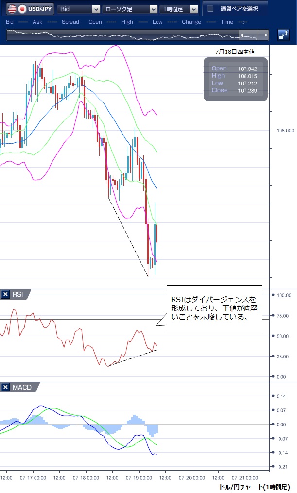 7月18日のドル/円相場は、東京時間からドルの上値は重く、日経平均の下落や米長期金利の低迷を眺めつつじり安の展開となり、一時107円64銭まで下落し、今月3日以来の安値をつけました。 その後は、ドルのショートカバーも入り、じりじりと上昇し、NY序盤にはフィラデルフィア連銀が発表した7月の製造業景況指数が21.8と前月から大幅に上昇し、市場予想の3.9も大幅に上回ったことを受け、108円01銭まで値を戻しました。 しかし、その後にウィリアムズ米NY連銀総裁やクラリダ米連邦準備理事会(FRB)副議長が積極的な利下げの可能性を示唆したため、市場では7月連邦公開市場委員会(FOMC)での0.50%の利下げを織り込む動きが強まり、ドル売りが優勢となって107円21銭まで下落しました。 トランプ米大統領が、ホルムズ海峡で米強襲揚陸艦がイランの小型無人機を撃墜したことを明らかにしたことも地政学リスクの高まりが意識されドル売りの要因となりました。 このドル下落で、ボリンジャーバンドを下抜け、安値圏でNYを引けています。 ただし、RSIを見ると、価格が下値更新したにもかかわらず、押しは浅くドルの下値が堅いことを示唆していました。 NY引け後に、ウィリアムズNY連銀総裁の発言は学術的内容であり、FOMCにおける政策行動に関するものではないとの一部報道が出たことを受け、ドルは107円半ばまで値を戻しています。 ※チャートは、ドル/円の1時間足ボリンジャーバンドRSIMACDを表示しています。