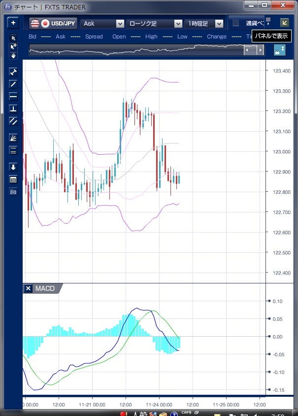 チャートは、ドル/円の1時間足ボリンジャーバンドMACDを表示しています。 昨日のドル/円相場は、東京市場が休場の中、先週末の流れを引き継ぎドルが堅調な動きでスタートしました。 朝方123円を回復すると、ドルの買い戻し意欲が強くなり123円28銭まで上昇しました。 この動きで、相場はボリンジャーバンドを上抜け、バンドウォークを示現しています MACDも先週末の買い転換以降、買いサインを続けておりドルの上昇を支持する形となっています。 その後欧州市場ではドルは高止まりの動きとなり、NY時間に入ると米国の10月シカゴ連銀全米活動指数、11月製造業PMI、10月の中古住宅販売件数が予想を下回ったことや、タルーロFRB理事の利上げに慎重な発言を受けてドル売りが優勢となり、122円78銭まで下押ししました。 NY時間の下押しの先駆け、MACDが欧州時間に既に売り転換していることが確認できます。 もっとも、ドルの下値では12月の利上げ観測によるドル買い意欲も強く、下値も限定的なものにとどまっています。 今週は、26日に米市場が感謝祭で休場となるため、直近の円安局面で円の売り持ち高を膨らませた海外市場参加者が、祝日を前に持ち高調整の円買いに動くとの指摘もありますが、利上げ観測を背景にしたドル先高感は強く、下値は限定的と見られるため、短期的には123円を中心とした現状のレンジ相場が続く可能性が高いようです。