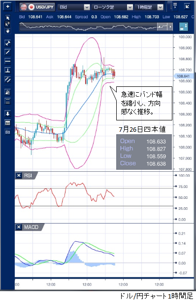 先週末(7月26日)のドル/円相場は、108円後半で方向感のない動きが続きました。 前日に海外市場で2週間半ぶり高値につけた流れを受け、ドルが底堅く推移したものの、米連邦準備理事会(FRB)が利下げに踏み切るとの見方が濃厚な中、上値では戻り売りを狙う向きが少なくなく明確な方向感が出ない状況です。 海外時間に入っても同様の動きが続き、NY序盤では4〜6月期の米実質国内総生産(GDP)速報値が前期比年率2.1%増と市場予想の2.0%増を上回る伸びとなったことでドル買いが優勢となったものの高値は108円83銭まででした。 その後、トランプ政権がドル切り下げに関して協議したとの報道を受け一時ドル売りが優勢となりましたが、トランプ米大統領らが却下したと報じられたことや、国家経済会議(NEC)のクドロー委員長もCNBCのインタビューで、米政府が協議の結果、為替介入の可能性を除外したと述べたことなどを受けドル買い安心感につながり、ドルの下値も108円60銭までとなりました。 ボリンジャーバンドを見ると、急速にバンド幅を縮小したあと横ばいが続いており、方向性を見出せません。 バンドを上下どちらにブレイクするかが注目されます。 ※チャートは、ドル/円の1時間足ボリンジャーバンドRSIMACDを表示しています。