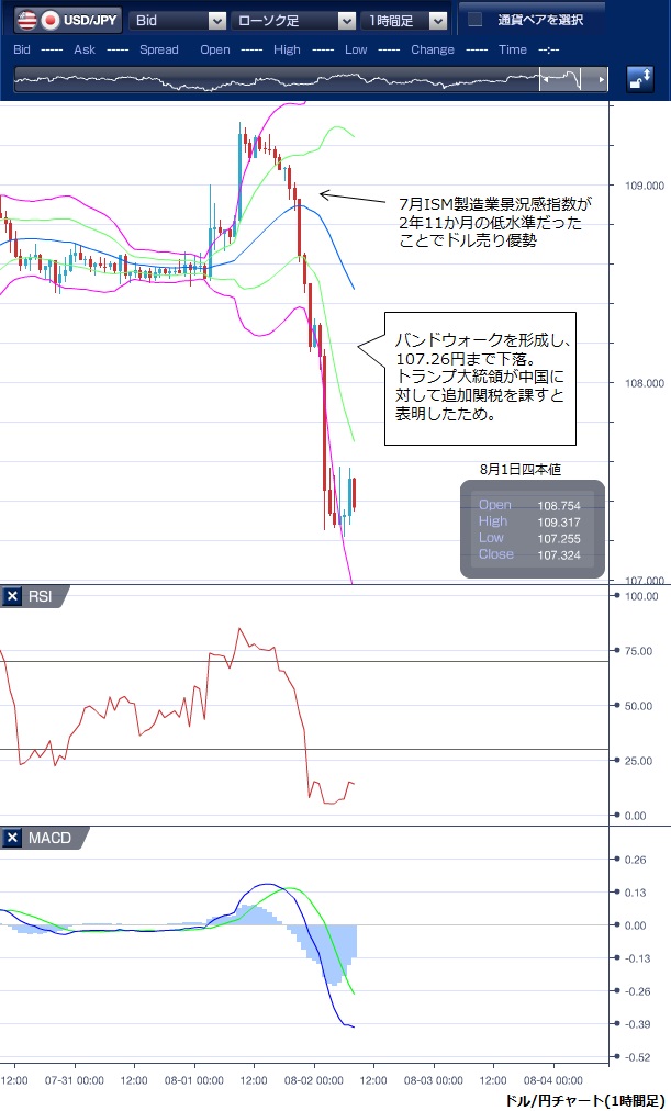 8月1日のドル/円相場は、東京時間では前日の海外市場の流れを受けドルの買い戻しが優勢で、109円を上抜けるとストップロスのドル買いを巻き込んで上昇が勢いづき、一時109円32銭と2カ月ぶりの高値をつけました。 海外短期投機筋のドル買いが目立っていたとの指摘もあります。 この上昇で、ボリンジャーバンドの上方バンドを上抜けましたが、フォーローはなくバンドウォークに形成には至りませんでした。 その後は109円台で足踏みしていましたが、NY序盤に発表された米サプライマネジメント協会(ISM)の7月の製造業景況感指数が2年11カ月ぶりの低水準だったことや6月建設支出も予想外のマイナスに落ちこんだことからドル売りが優勢となり108円前半まで反落しました。 さらに、トランプ大統領がツイッターで米中貿易協議での中国の姿勢を批判し「9月1日から3000億ドル分の中国製品に10%の追加関税を課す」と明らかにしたことから米中摩擦激化への懸念からドル売り圧力が強まり、108円を割り込むと一段とドル売りが加速、下方向のバンドウォークを形成しながら107円26銭まで下落しました。 FOMCをこなし、ドル高への期待感が広がった中での米国の対中関税賦課発表で市場のムードは一気に反転してしまっています。 市場では6月25日の107円75銭水準が視野に入ってきており、下値リスクが高まっています。 ※チャートは、ドル/円の1時間足ボリンジャーバンドRSIMACDを表示しています。