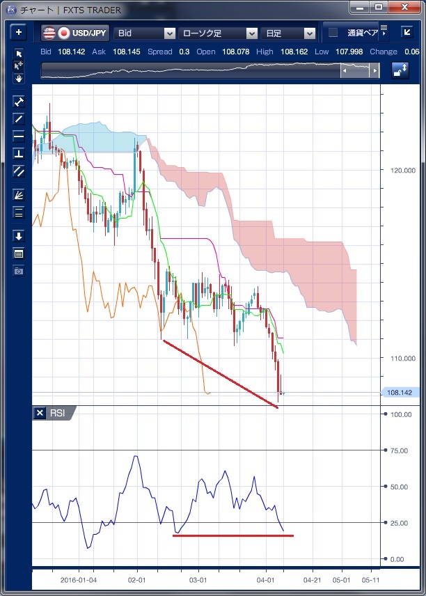 チャートは、ドル/円の日足一目均衡表RSIを表示しています。 先週のドル/円相場は、終始ドルが軟調な推移となりました。 特に、6日発表の3月の連邦公開市場委員会(FOMC)議事録で、米連邦準備制度理事会(FRB)が「世界リスクの上昇で、警戒が正当化される」との方針がコンセンサスであったことが確認されたことでドルやクスが加速、7日には一時107円67銭まで上昇し、2014年10月29日以来の108円割れとなりました。 その後週末には、麻生財務相が為替市場の動向に関し「一方向に偏った動きが見られるのは確かだ」とした上で、「緊張感を持って見守っているところだが、場合によっては必要な措置 を取る」と語ったことを受け、109円台まで買い戻される局面がありました。 もっとも、週末の海外市場では14、15日にはワシントンでG20財務相・中央銀行総裁会議が開催されること、さらには5月の伊勢志摩サミットを控えていることなどを考えると、自国通貨安を防止するための円売り介入は難しいとの見方が支配的となり、結局108円前半まで下押しして週を越えることとなりました。 今回の急激な円高の背景には、日欧の中央銀行による積極的な金融緩和策よりも、FRBの利上げが緩やかになるという米国の中央銀行の政策が強く影響したといえそうです。 その意味では、日本銀行がさらにマイナス金利を押し進めても、米国の利上げ速度が上がらない場合は円を押し下げることは難しいということになります。 ただし、テクニカルで見ると、価格が下がり続けるなかRSIの水準が下げきっておらずダイバージェンスが形成されています。 これは、価格が既に十分売られ過ぎていることを指しており、いつ反転してもおかしくない状況です。 G20の協議の行方次第では、相場が落ち着きを取り戻す可能性もあるかもしれません。