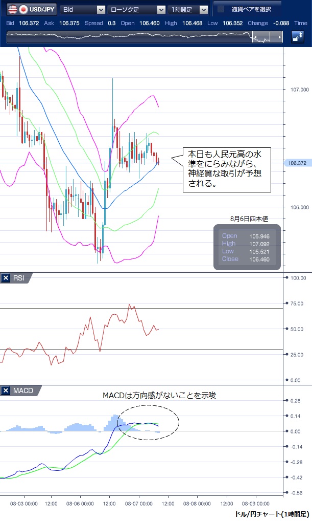 8月6日のドル/円相場は、東京早朝に米財務省が中国を為替操作国に認定したと発表すると、リスク回避の円買いが強まる形で一時105円52銭まで下落、1月の円急騰時以来の安値を更新しました。 しかし、午前10時過ぎ、中国人民銀行が人民元の対ドル基準値を1ドル=6.9683元と市場予想より元高水準に設定し、継続的な元安誘導がないことが明らかになるとドルは急速に買い戻され、朝方ドルを売り込んでいた短期筋のストップロスを相次ぎ巻き込み、一気に107円11銭まで値を戻しました。 ただ、ドルの買い戻しが一巡すると、その後上値を買い上げるフォローはなく、再び反落し106円後半での揉み合いに入りました。 海外時間に入っても、米中貿易・通貨戦争激化に対する過度な警戒感が低下したものの、警戒感そのものは根強く残っており、ドル買い・ドル売りともに積極的なポジションメイクはしにくく、東京午後と同様の106円台半ばを中心とした方向感のない動きが続きました。 テクニカルで見ても、東京午後からはMACDとシグナルがゼロ水準に近いところで重なっており、方向感がないことを示唆しています。 本日も人民元の水準をにらみながら神経質な動きが予想されます。 ただし、昨日のドルショートは大方切らされており短期ポジションは軽くなっていると思われることから、ドルの上値は限られたものとなりそうです。 ※チャートは、ドル/円の1時間足ボリンジャーバンドRSIMACDを表示しています。