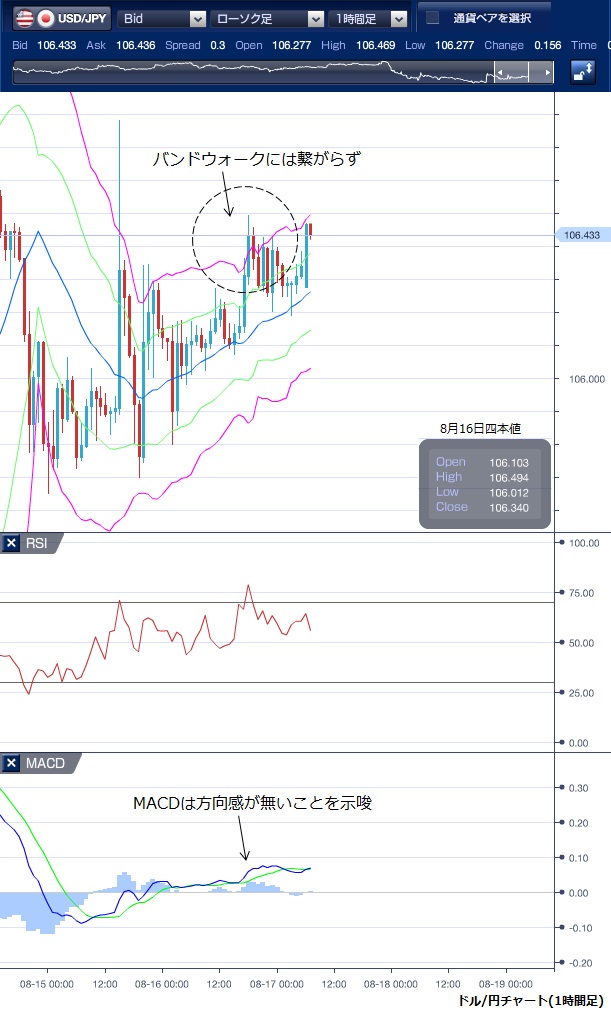 先週末(8月16日)のドル/円相場は、106円前半での動きが続いたものの、下値は底堅く106円割れが回避される動きとなりました。 前日一時1.4750%付近と2年ぶりの低水準まで落ち込んだ米長期金利が1.55%台に持ち直したことや小幅な株高がドルの支援材料となったと指摘されます。 欧州時間に入ると、中国やドイツが景気刺激策を検討していると伝わり、投資家心理の悪化にひとまず歯止めがかかると、一時106円49銭まで上昇する局面もありましたが、106円半ば以上ではドル売り意欲も強く上値も限定的となりました。 この上昇局面では、ボリンジャーバンドを上抜けたものの、バンドの拡大は伴わず、バンドウォークの形成には至りませんでした。 NY時間に入っても、方向感のない動きは継続し、106円半ば手前での足踏みが続きました。 MACDとシグナルがゼロ近辺での交錯を続けており、相場の方向性が出ていないことがしおさされています。 市場の焦点は、今週末に予定されている米ワイオミング州ジャクソンホールでのパウエル米連邦準備理事会(FRB)議長の講演に向いているとされており、今週も106円台での神経質な取引が続きそうです。 ※チャートは、ドル/円の1時間足ボリンジャーバンドRSIMACDを表示しています。