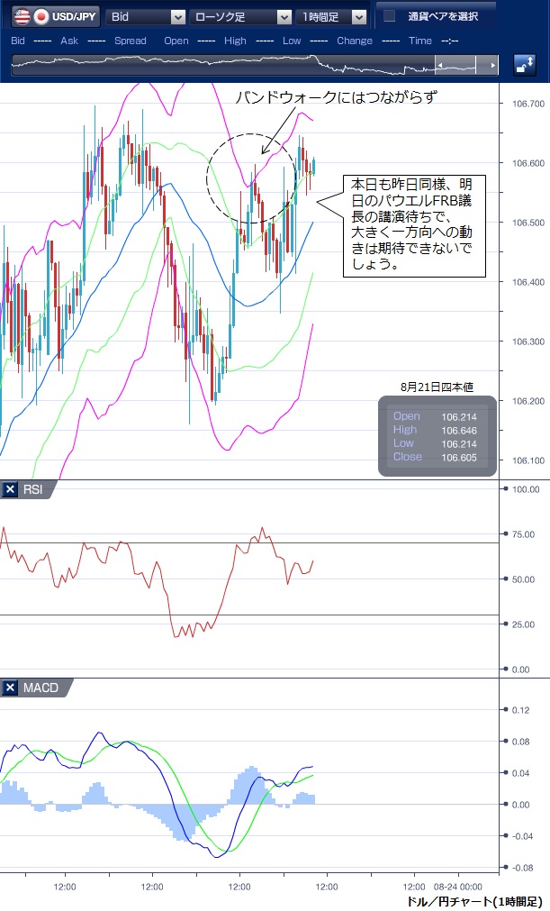 8月21日のドル/円相場は、東京時間では前日海外市場での下落分を取り戻すかのようにドルが反発しました。 特段の手がかりはなかったものの、米国金利が小幅に上昇したことなどを受け、前日に売られたドルの買い戻しにつながったと指摘されます。 この流れで欧州時間には106円60銭まで上昇し、ボリンジャーバンドを上抜けましたが、バンドウォークにはつながらず、上値抵抗となり反落しました。 NY時間に入ると、米国の7月中古住宅販売件数が予想を上回ったことでドル買いが優勢となり、その後発表された7月開催の米連邦公開市場委員会(FOMC)議事要旨が市場の予想ほどハト派色が強いものではなかったことから、積極的な利下げ予測が後退しドルは一段高となり、106円65銭まで上昇し、ほぼ高値でNYを引けています。 昨日も、パウエルFRB議長の米カンザスシティー連銀主催の経済シンポジウムでの講演を23日に控えて、金融政策に関する最新の見解を見極めたいとの雰囲気が強く、ポジション調整の域を出ない取引となっていましたが、本日も同様で大きく一方向への動きは期待できないでしょう。 ※チャートは、ドル/円の1時間足ボリンジャーバンドRSIMACDを表示しています。