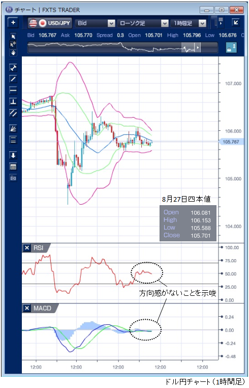 最新のウィークリーレポートはこちら(2019/08/19)(PDF) 8月27日のドル/円相場は、105円後半での取引が続きました。 先週末のドル急落と昨日のドル反発でマーケットは大きく傷んだため、模様眺めのムードが強い相場となりました。 東京時間では、月末を控えた輸出企業のドル売りが上値を抑える要因となりました。 欧州勢が参入しても同様の状態が続きましたが、NY時間に入ると米国の8月消費者信頼感指数や8月リッチモンド連銀製造業指数が予想を上回ったことを好感し、ドル買いが優勢となり106円台を回復する局面があったものの、すぐに反落し105円台後半の動きが続きました。 テクニカルで見てもMACDとシグナルがゼロ水準で交錯を続けており、相場に方向性がないことが示唆されています。 また、NY時間ではRSIも中立の50水準での推移となっており明確な方向性は感じられません。 米中貿易摩擦を巡る警戒感がくすぶるなか、景気後退の前兆とされる米長短金利の逆転(逆イールド)が一段と進んでおり、これがドルの上値を抑える要因として意識されそうです。 ※チャートは、ドル/円の1時間足ボリンジャーバンドRSIMACDを表示しています。