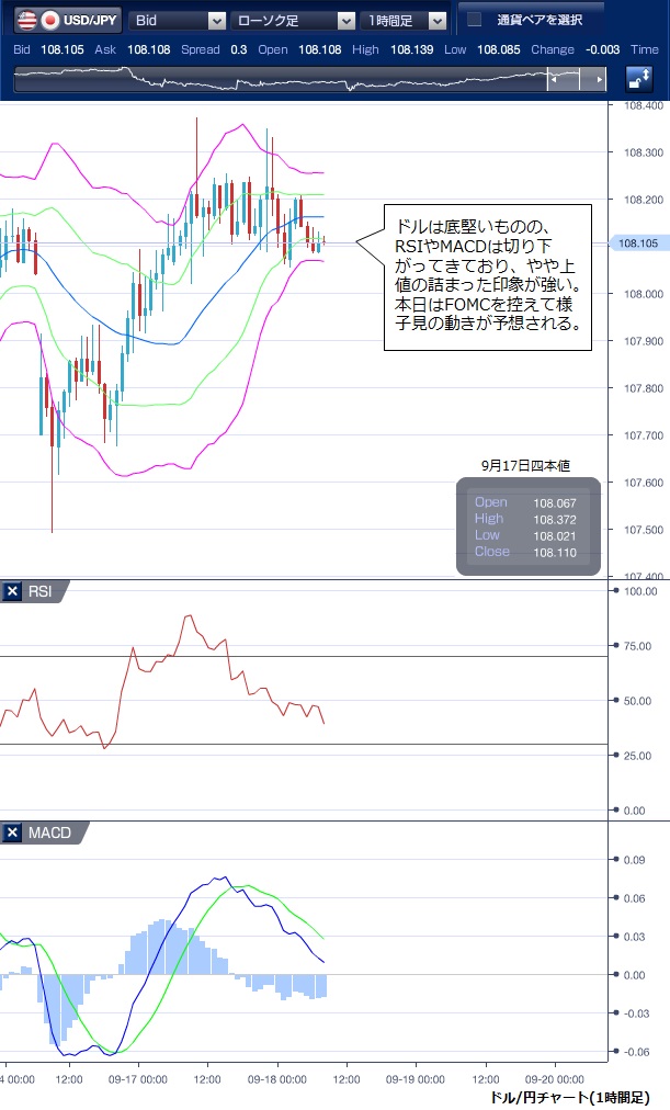 9月17日のドル/円相場は、108円前半での取引が続きました。 週初に107円半ばから始まった相場がじりじりと反発し、昨日朝方には108円台を回復、その後108円37銭と8月1日以来1カ月半ぶり高値を更新しました。 米国が戦略石油備蓄の放出を承認したこと、リスク回避的なドル買いが勢いづいたことなどが背景にあると指摘されます。 ただし、上値を追う勢いも強くはなく、その後は108円前半で方向感のない動きが続きました。 NY時間に入ると、米国の8月鉱工業生産や8月設備稼働率が予想を上回ったため一時ドル買いが強まったものの、高値は108円35銭までで、東京高値を更新できませんでした。 その後は、米連邦公開市場委員会(FOMC)の結果発表を本日に控えて様子見姿勢が強く、小幅な値動きに終始しました。 テクニカルで見ると、ドルは底堅いながらもRSIMACDは切り下がってきており、やや上値の詰まった印象となっています。 FOMCは前回会合に続き、0.25%の利下げを決める見通しですが、先行きの金融政策を占ううえでパウエル米連邦準備理事会(FRB)議長の記者会見や、FOMCメンバーらの政策金利見通しが注目されます。 ※チャートは、ドル/円の1時間足ボリンジャーバンドRSIMACDを表示しています。