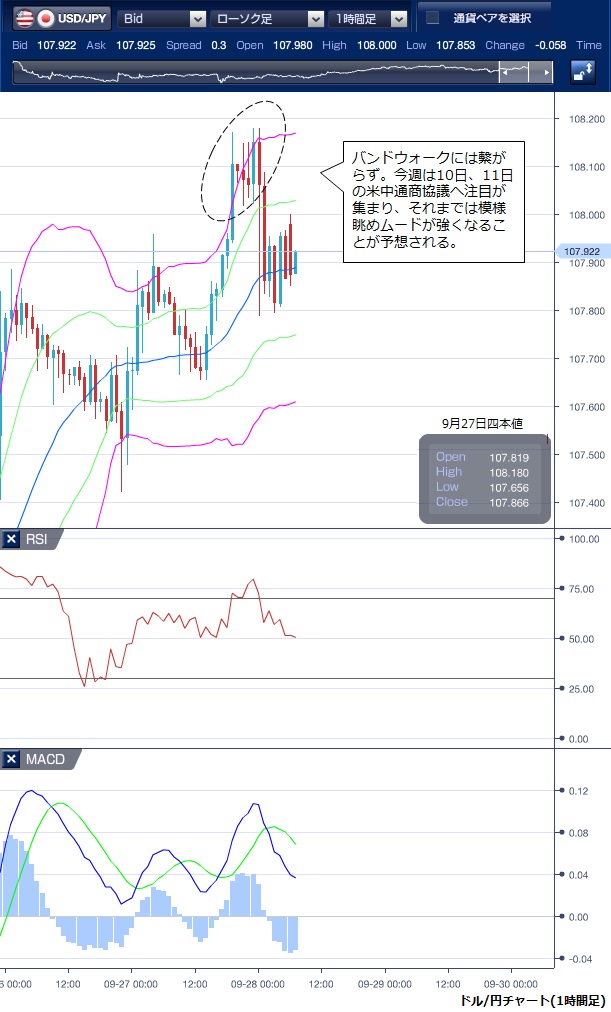 先週末(9月27日)のドル/円相場は、東京午前では利食いのドル売りが先行したものの107円台後半で底堅い動きを続けました。 また、午後になると再びドルが値を戻し、欧州序盤には108円台を回復する動きとなりました。 NY序盤では、9月ミシガン大学消費者信頼感指数確報値が予想を上回ったことや一部報道で米中の閣僚級の貿易協議が10月10〜11日に開かれると伝わったことなどを受けドルが底堅く推移し、一時108円18銭の高値を付けました。 欧米時間でのドル上昇でボリンジャーバンドを上抜けましたが、バンド幅の拡大は伴わず、108円台では上値の重い印象となっていました。 その後、複数の米メディアが「トランプ米政権が中国への証券投資を制限することを検討している」と報じると米中通商交渉に対する楽観論が後退し、ドル売りが優勢となり107円79銭まで反落、この水準で週を越えています。 今週は、10日、11日の米中通商協議へ注目が集まり、それまでは模様眺めムードが強くなることが予想されます。 ※チャートは、ドル/円の1時間足ボリンジャーバンドRSIMACDを表示しています。