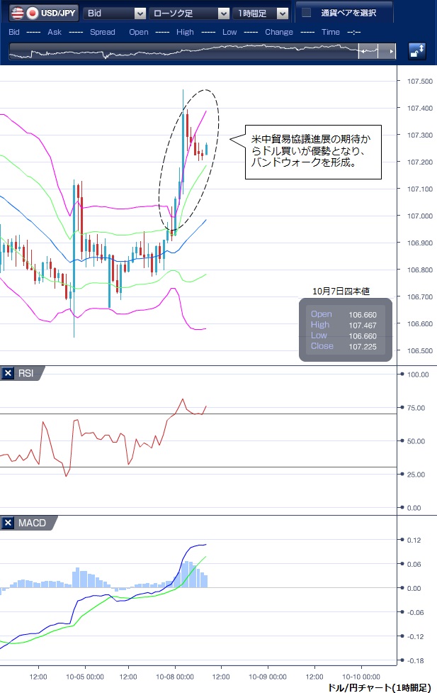 10月7日のドル/円相場は、朝方107円ちょうど付近から106円55銭 まで一気に急落して始まりました。 中国当局者が米国との貿易協議に先立ち、トランプ大統領が求める幅広い通商協定で合意することに消極的な姿勢を示しているとの報道が要因でした。 しかし、すぐに106円85銭まで値を戻し、その後は106円後半での揉み合いが続きました。 NY時間に入ると、米中が部分的、暫定的なディールで合意する可能性が報じられたことやクドロー国家経済会議(NEC)委員長が「中国企業の上場廃止は選択肢にない」としたことが好感されドル買いが優勢となり107円を回復しました。 107円越えでは損切りのドル買いも巻き込み、ボリンジャーバンドのバンドウォークを形成しながら、一時107円46銭まで上昇しています。 また、今週は米国債入札が相次ぐとあって、持ち高調整の米債売りで米金利が上昇したこともドルの支援材料となったと指摘されます。 昨日は、107円を回復する動きとなりましたが、10〜11日に予定される米中貿易協議を巡り思惑が交錯しており、一段のドル上値追いにはリスクがありそうです。 ※チャートは、ドル/円の1時間足ボリンジャーバンドRSIMACDを表示しています。
