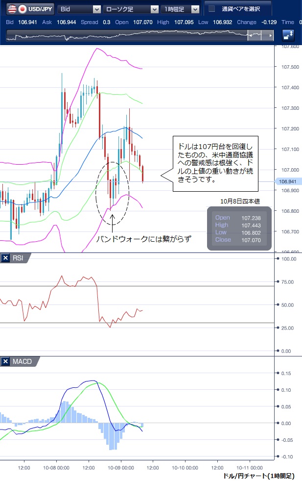 10月8日のドル/円相場は、東京午前は107円半ばでドルが底堅い動きとなりました。 連休明けの中国株が堅調に推移したことなどが背景となってドル買いにつながったとの指摘があります。 しかし、前日の高値を越えられなかったことで徐々に上値が重くなり、欧州勢が参入してくるとドル売りが優勢な動きに転じました。 107円半ばからのドル売りが厚く上値が重くなったことや10〜11日に予定される米中貿易協議が難航するとの観測からドルが売られ、一時106円80銭の安値を付けました。 この下落で下方ボリンジャーバンドにタッチしましたが、バンドウォークにはつながらず、下値抵抗として機能していました。 NY時間に入ると、パウエル米連邦準備理事会(FRB)議長が講演で、保有資産の拡大を近く始める方針を示したことから朝安で始まった米株式相場が下げ渋り、リスク回避姿勢が後退して107円30銭まで買い戻されました。 ドルは107円台を回復したものの、米中通商協議への警戒感は根強く、ドルの上値の重い動きが続きそうです。 ※チャートは、ドル/円の1時間足ボリンジャーバンドRSIMACDを表示しています。