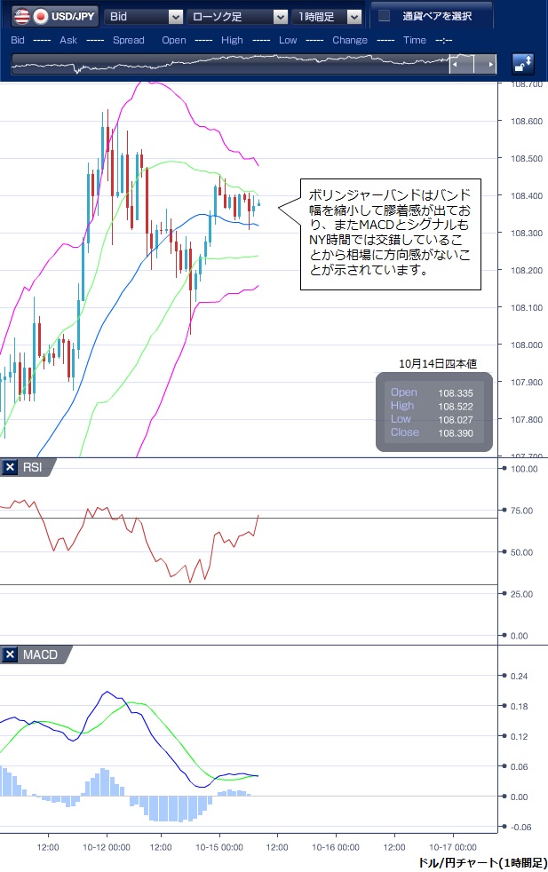 10月14日のドル/円相場は、東京が体育の日、米国がコロンバスデーでそれぞれ休日のなか、108円前半で方向感のない動きが続きました。 東京朝方は、利食いのドル売りに押されドルの上値が重く、欧州時間には一時108円02銭まで下押したものの、その後は切り返して108円45銭まで値を戻しました。 NY時間では、積極的な売買は見られず、108円30銭台での小動きが続きました。 テクニカルで見ても、ボリンジャーバンドはバンド幅を縮小し膠着感が出ており、またMACDとシグナルもNY時間では交錯してしまっており、相場に方向感がないことが示されています。 ※チャートは、ドル/円の1時間足ボリンジャーバンドRSIMACDを表示しています。